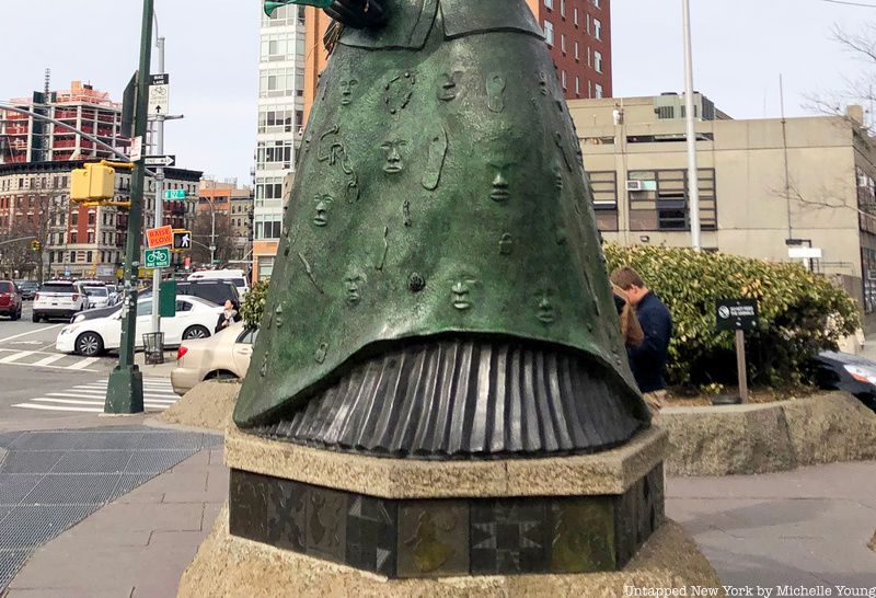 This monumental Harriet Tubman memorial was erected in 2008 in a small space where Frederick Douglass Boulevard, St. Nicholas Avenue and 122nd St. triangulate to form Harriet Tubman Triangle public park. The over ten foot bronze statue has a remarkable dual patina of black in the areas of her skin and a green in the clothing she wears. Her enormous billowing petticoated skirt is embedded with faces representing the freedom seekers she helped. Emerging from the back of her skirt are thick gnarled tree roots that give the appearance of being pulled from their foundation as Harriet plows ahead, determined in her goal to march on in the name of freedom.