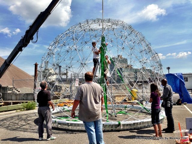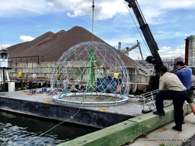 Yesterday, the Harvest Dome, a floating installation of 500 broken umbrellas and empty soda bottles, made its way by barge from the Brooklyn Navy Yard to Inwood, Manhattan. The project, conceived by Amanda Schachter and Alexander Levi at SLO Architecture, is meant to “reveal New York City’s primeval ecologies.” The Dome’s base is made up of soda bottles, which will allow it to alternate between floating on water and resting on the mud-flat at the Inwood Hill Park inlet as the tide rises and falls.
