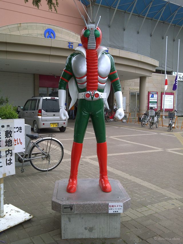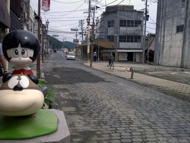 Ishinomaki is a quiet town whose main attractions are Manga Road and Mangattan, an oblong-shaped museum dedicated to Shotaro Ishinomori. Ishinomori is a mangaka or manga writer, most renown for his 1970s popular anime Kamen Rider and often compared to American Marvel comic book writer, Stan Lee, creator of Spiderman and other heroes. Manga Road begins right outside of the Ishinomaki train station, spans across the city, and ends at the Mangattan museum, or Ishinomori Manga Museum, built in 2001. The edifice, comically shaped like a bubble and UFO saucer, boasts of Ishinomori’s original artwork-displays of Cyborg 009-as well as characters from Android Kikaider, Robocon, and other anime series. Along Manga Road, various life-sized iron anime figurines are bolted to the ground. Ranging from superheroes to beloved characters, these structures stand out in the tsunami aftermath, still brightly colored.