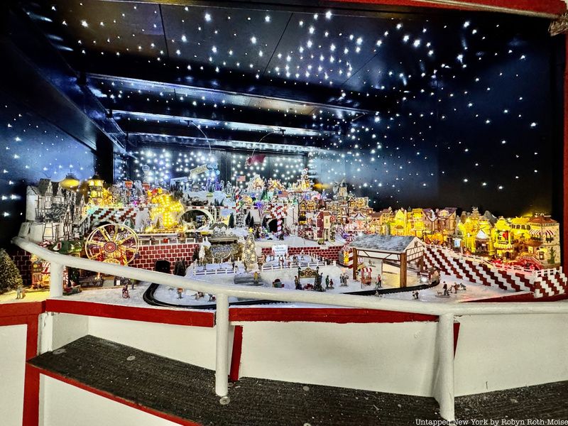 Every year the village grows and becomes more elaborately detailed. This year, Sanchez told the NY Post the village contains around 4,000 lights (each meticulously glued to the scene by hand), five miniature trains, and a functional ski lift. The ski lift is new and took some resourceful rigging to make work. Looking into the scene, you can see animated figures making snow angels, skating on a pond, riding a merry-go-round, playing holiday music, and taking part in more merry activities.
