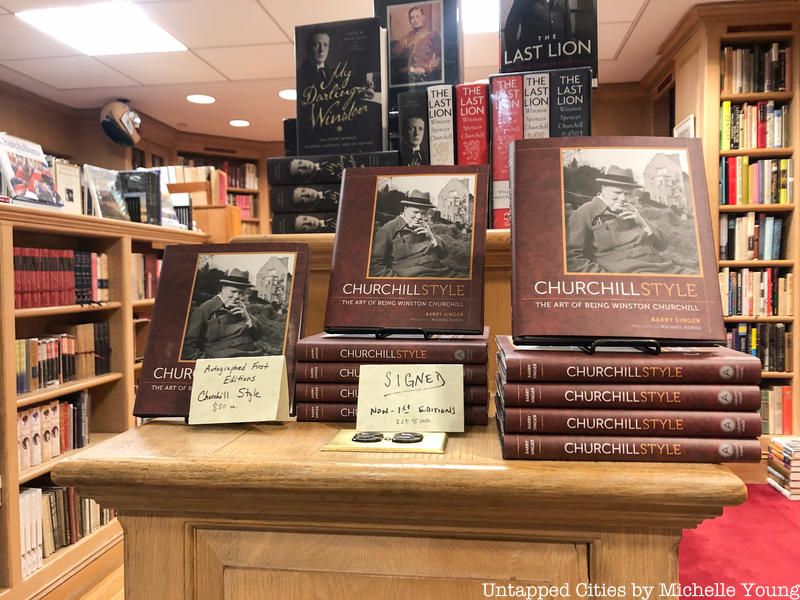 If you go looking for Chartwell Booksellers, you may find yourself walking in circles around a Midtown block. 55 East 52nd Street is home to the investment company Blackrock, with a large indoor privately-owned public space on the ground floor. You’ll see a pleasant waterfall, a Starbucks, maybe you’ll cross the public space and find yourself on 53rd Street. But, on a wall opposite from all the buzz is a sign in a royal red color with an arrow: “CHARTWELL Booksellers. The World’s Only Winston Churchill Bookshop.” Follow it behind the elevator banks and discover a handsome store with curved window displays and wooden bookshelves, and a lot about England’s most famous prime minister.