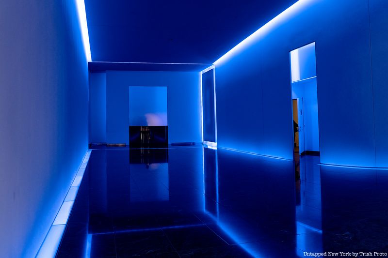 Turrell is renowned for his glowing exhibitions that play on light and space and often encompass entire buildings or rooms. He transformed the lobby into a forced-perspective lightbox that changes color 24 hours a day, with LEDs throwing pink and blue light onto the white plaster walls. The colors shift frequency and mood depending on the time of day, reflecting the bustling chaos of Fifth Avenue outside. The three-dimensional light sculpture transforms itself over the course of the day, making multiple visits worthwhile.