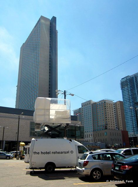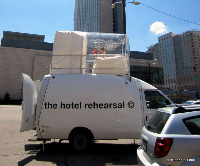 One block south of the busy Sixteenth Street Mall in downtown Denver, rehearsals are underway. From a small work van, a single occupant is raised to the sky in an inflatable hotel room with hydraulic buoyancy, allowing for an unimpeded view of the city from an all-white, luxurious bubble complete with shower, air conditioning, a sofa that turns itself into an airbed, and well-stocked magazine rack. The same view, that is, one might have if a “real” hotel went up on this parking lot.