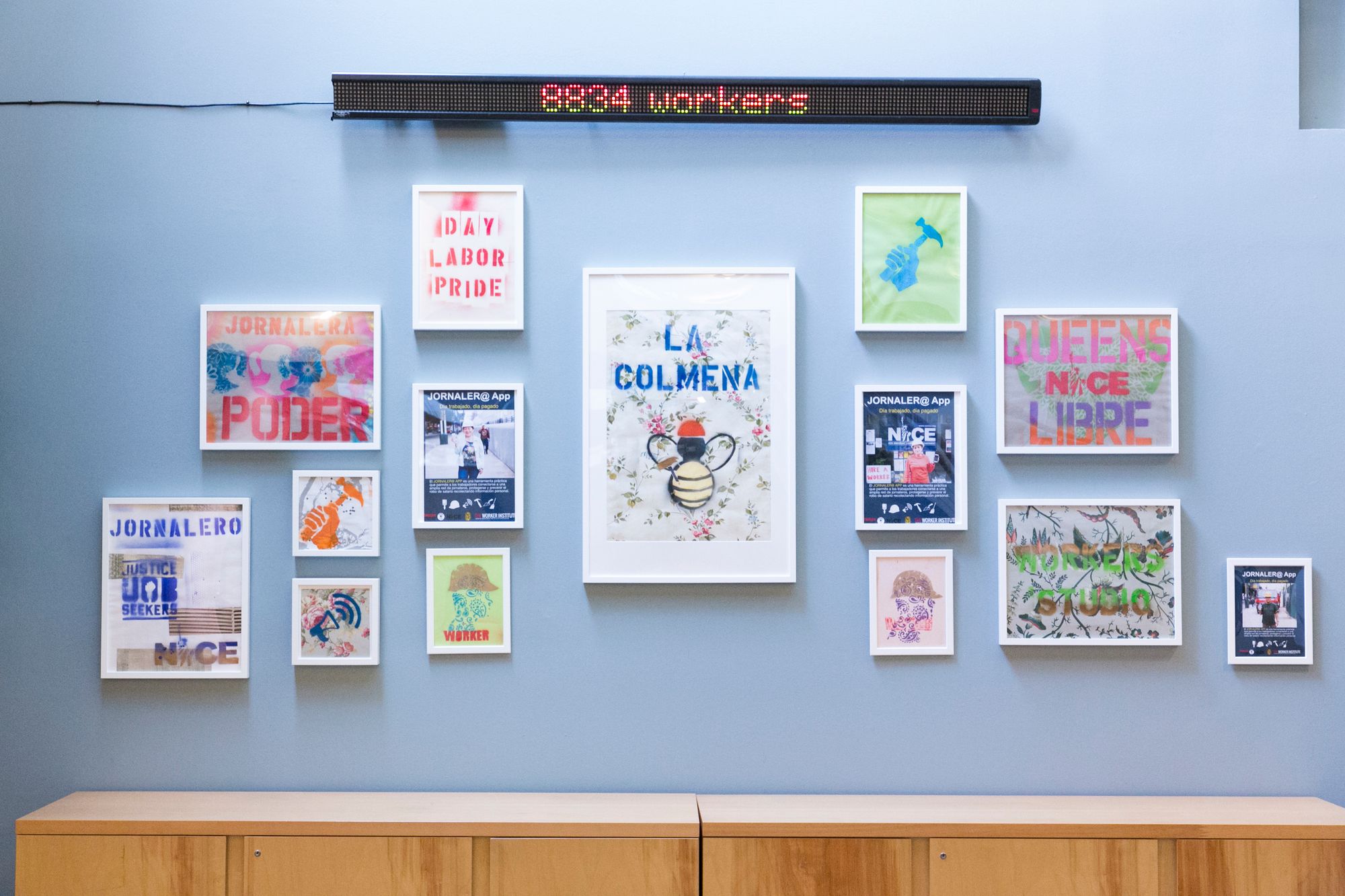 The exhibit winds all the way through the Nathan Cummings Foundation offices, and the first display you encounter, in the front hall, shows an LED ticker chronicling the instances of wage theft in real time, using data from the Jornalero Wage Theft App, which allows laborers to log their hours and wages, as well as rate, photograph, and mark the location of their employers, to alert other workers.