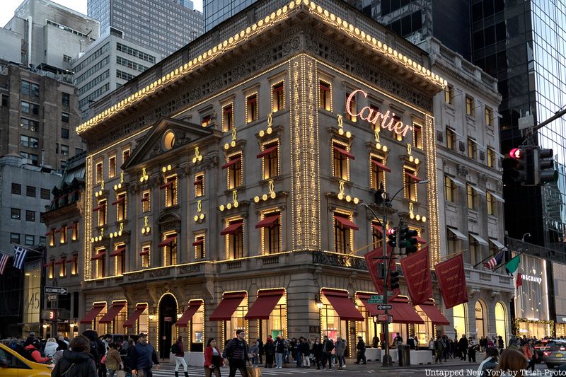 This year’s Cartier holiday look is a bit more reserved than years past. Instead of a giant red bow that wraps around the entire building or a giant illuminated wall of lights that transforms it into a present, the historic storefront is elegantly accented by glowing string lights.