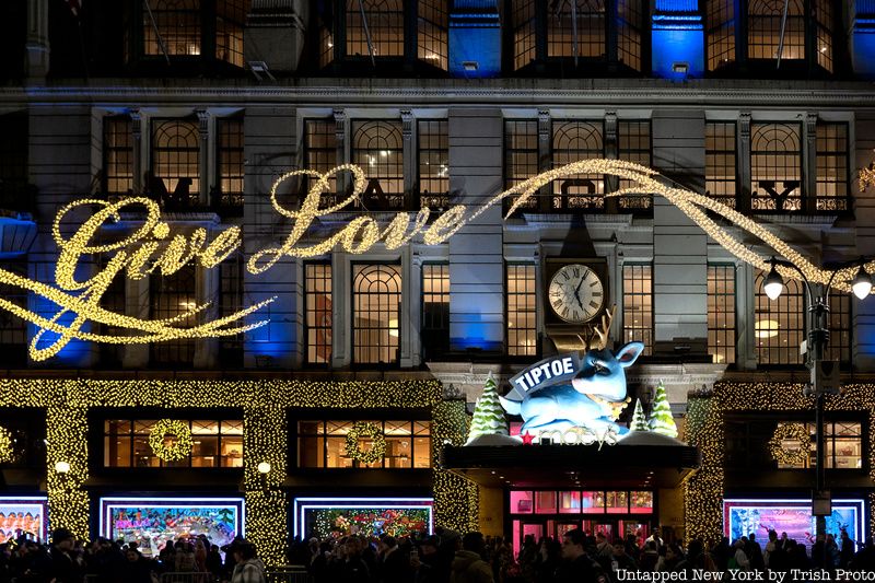 Tip-toe the blue reindeer returns to Macy’s holiday windows this year with a few cuddly friends! The theme of Macy’s 2022 window display is “Give Love.” The narrative that unfolds as you walk along the side of the store is that of Tip-toe traveling across the globe to visit all of her woodland creature friends.