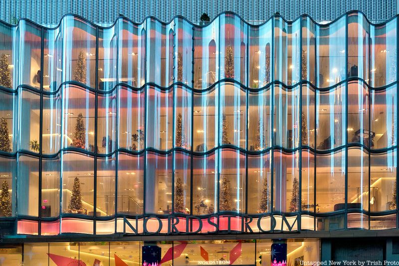 Unlike the other stores on Fifth Avenue which have box window displays, Nordstrom has an undulating multi-story windowed facade. To best show the holiday cheer in this store, the decorations are spread throughout the interior, but you can still see the decorations from outside, especially some of the 120 pink and green metallic trees.