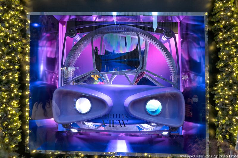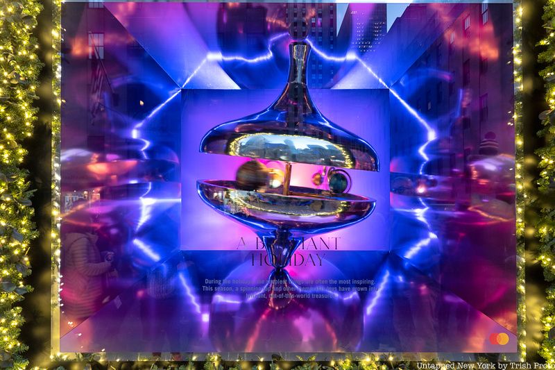 The star’s flamboyant stage costumes also inspired the window displays, which will move in tandem with the light show. Inside the windows at Saks, onlookers will find classic holiday toys with a futuristic twist. There’s a shiny spinning top with marbles inside, a View-finder with slides, and an iridescent kaleidoscope, among others, all painted in reflective metallic colors.