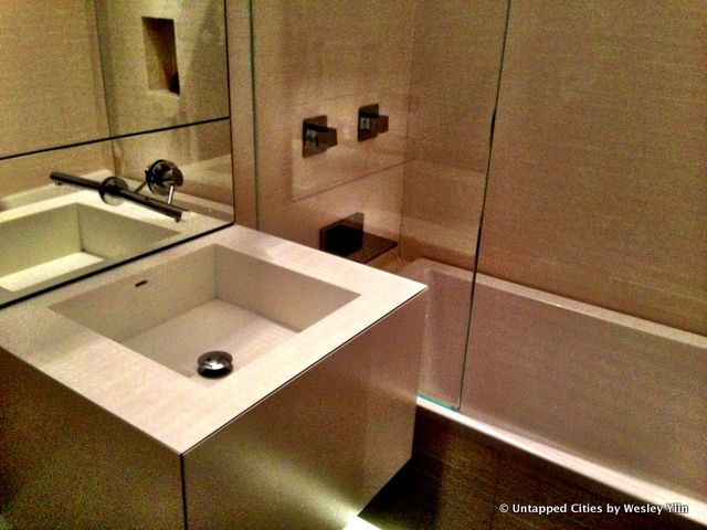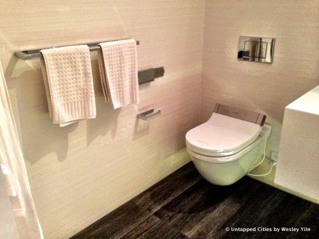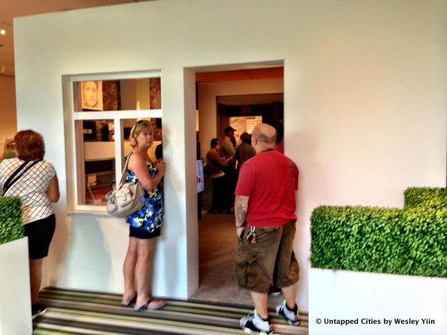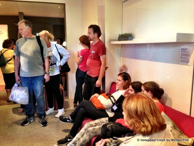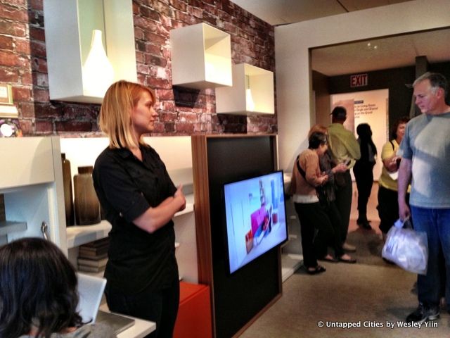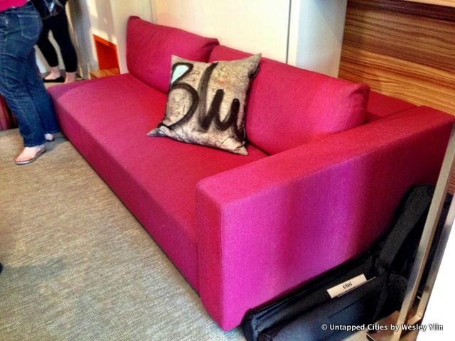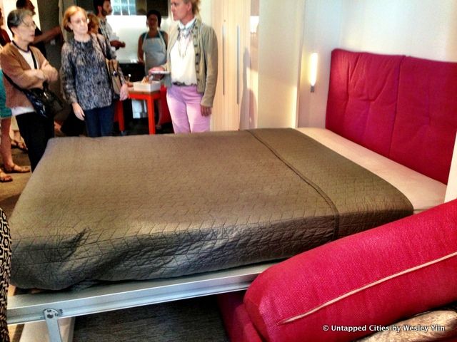 The exhibit’s centerpiece is a 325 square foot micro-apartment designed by the Italian studio Clei and furnished by Resource Furniture. Yesterday, we visited the apartment, in which four Curbed editors had been invited to stay for 24 hours while live blogging their experiences. We were wowed by the design of the unit, which features many multipurpose pieces of furniture, like an ottoman that could be taken apart and reassembled as a coffee table and stools. Most impressive was the unit’s large bathroom, which didn’t seem to fit the unit’s theme of “micro-everything” until we learned that it was already the smallest size allowed for bathrooms in new developments, according to ADA laws. Check out some more photos of the unit below.