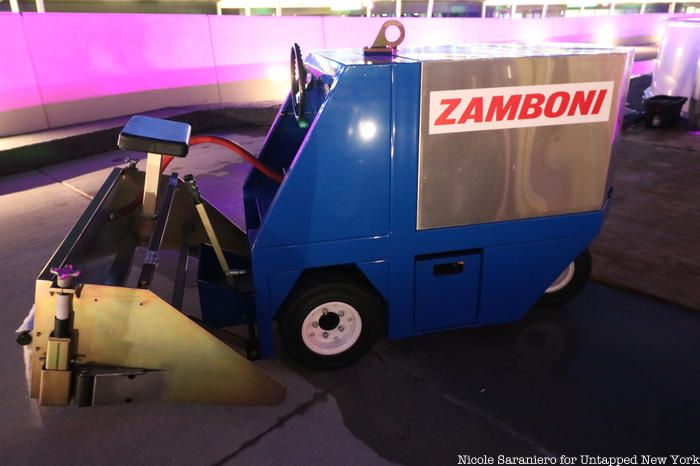 Five hundred plastic tubes running coolant underneath the ice keep the 56-by-44 foot rink took frozen. A tiny zamboni sits outside the rink, at the ready to smooth out the ice. Over the course of the season, the zamboni will travel a total of sixty miles around the ice, reaching a top speed of 7 miles per hour.