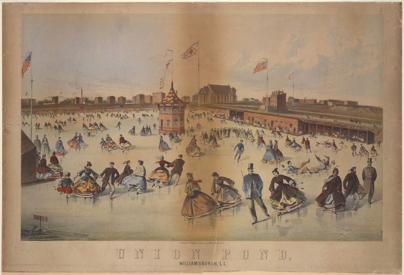 Ice skating was not just limited to Manhattan; popular sites in Brooklyn included McCarren Park, Prospect Park, Sunset Park, and Commodore Barry Park. There was a tradition of “raising the red ball” on Brooklyn streetcars as a way of indicating skating conditions at Prospect Park. Union Pond in Williamsburg was another notable spot, opening in 1861. Union Pond, which was cleaned by several horses, featured live music and advanced lighting systems, as well as nearby pagodas. Staten Island may have had its own rink at Willowbrook Park as well.