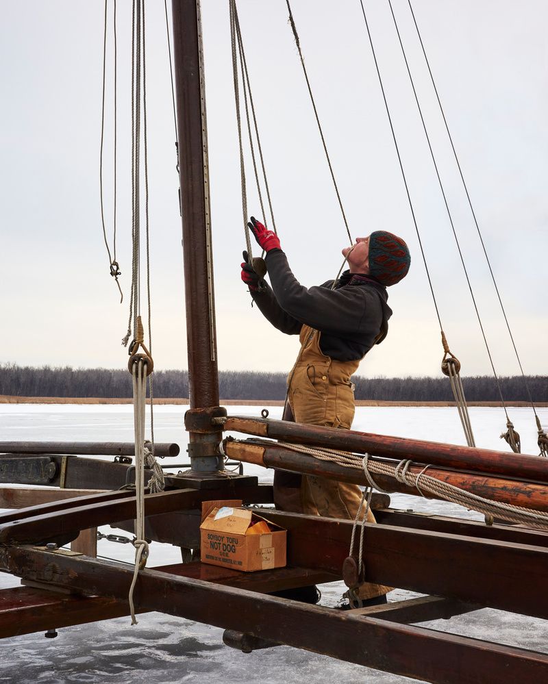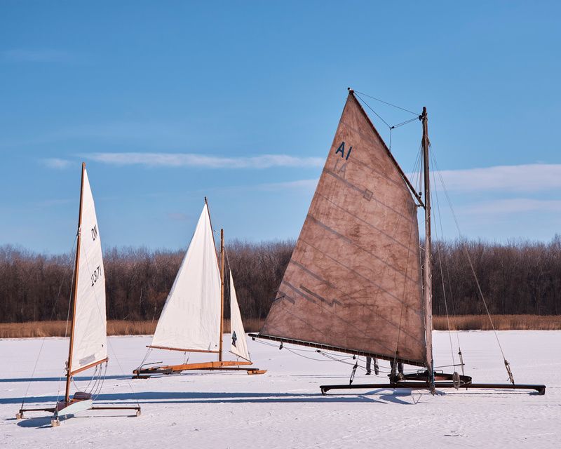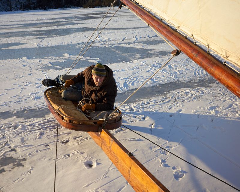 “The boats we sail are plenty fast, and we regularly compete against one another,” Wills shares, “But just as one would not alter the inherent design of a historic Bugatti race car to go faster, we respect and preserve this integral part of ice sailing history which would otherwise be lost.” Wills estimates that only around 70 ice yachts, out of the multiple hundreds that were built between the 1820s and 1910s, still exist today. Even fewer are in sailing condition. Among the many boats the Trust has been able to restore is the World Champion JACK FROST, a vessel originally built in 1883 for Commodore Archibald Rogers.