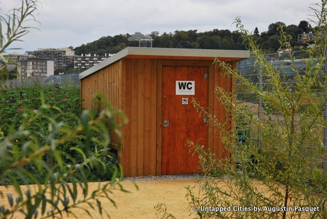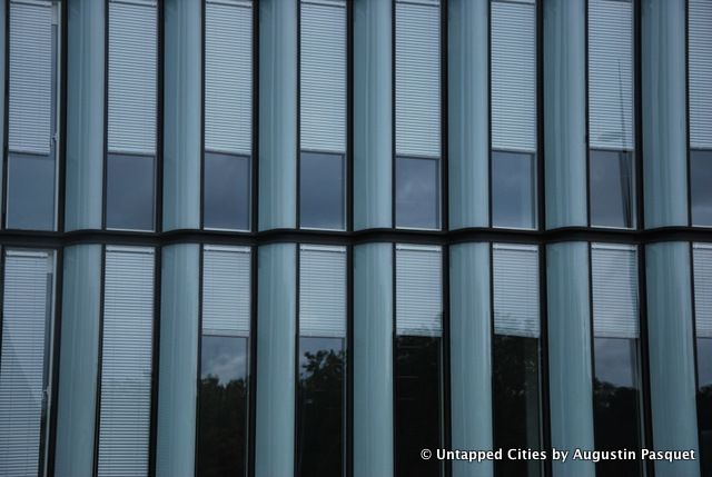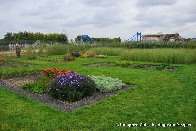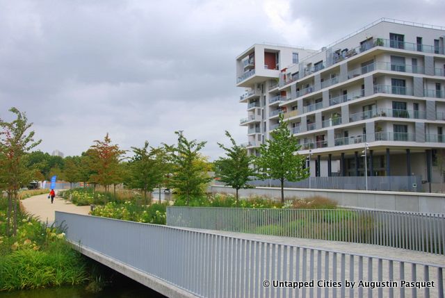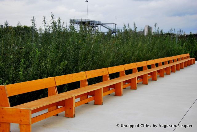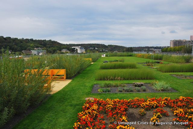 Even more striking is the contrast between the completed areas of the park and the work yet to be done. There was a new Renault building called the ECO2 Center focused on sustainable and affordable automobiles. There was the perfectly manicured and landscaped lawns (très French) and a new pop-colored logo to go in tandem with strategic marketing along the highway: “Ile Seguin_Rives de Seine: Ici, un nouveau quartier”–here, a new neighborhood. Nature seemed to be placed in stark contrast with industrial materials–particularly concrete and steel. Seems a little harsh to me, but maybe that is precisely Nouvel’s homage to the site’s industrial heritage. More likely, the planned park as “flourishing natural habitat” just isn’t finished yet.