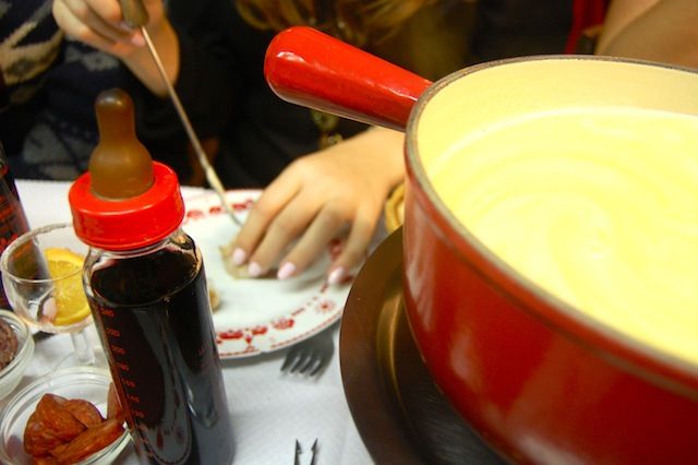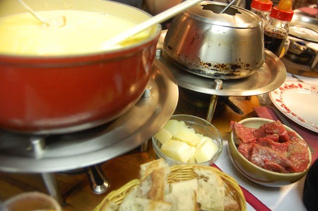 For about 25 euros you’ll get the fondu of your choice (cheese or meat) with an apéro, 1 baby bottle of wine, dipping delights and a dessert. Even if you don’t speak French, show off your skills and memorize “fromage” (cheese) or “viande” (meat)–the two choices of fondu they have–and the Parisian that runs the place will be so happy you’ve made the effort.