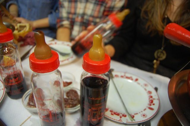 When he comes by to take your order, you probably will not have thought about it yet- as you’ll be eyeing the baby bottles they use for wine left and right”¦ and about halfway through the meal you’ll realize why they made that wise serving decision: these small tables will have you elbowing over things every few minutes!