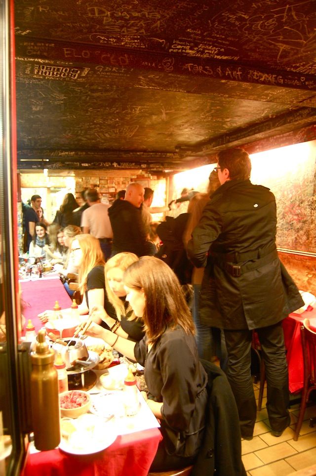 This little restaurant has the most personality possible for the number of meters squared it takes up. You’ll run into two rows of tables down the two walls as soon as you open the brass baby bottle handled door into the land of fondu à la parisienne. The walls are covered from floor to ceiling with carvings and messages of all styles and colors- some dating back decades and others from a few days prior. Before you can get all snug you’ll have to climb over the table to get into the bench side- and no the server will not pull the table out for you- he will simply offer a hand and you’ll hope you don’t knock over the cute couple next to you’s bowl of fondu. It’s all a part of the experience!
