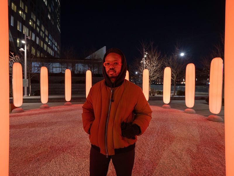 Breathing has become a loaded word this year but the new interactive public art installation Breathing Pavilion by artist Ekene Ijeoma encourages visitors to do just that. The immersive installation at The Plaza at 300 Ashland comprises a 30-foot circle of twenty, nine-foot-tall, two-tone inflatable columns that slowly modulate in brightness to illustrate a deep breathing technique designed to bring calm. Viewers are invited to breathe in time with the changing light to center themselves in a communal rhythm of respite.