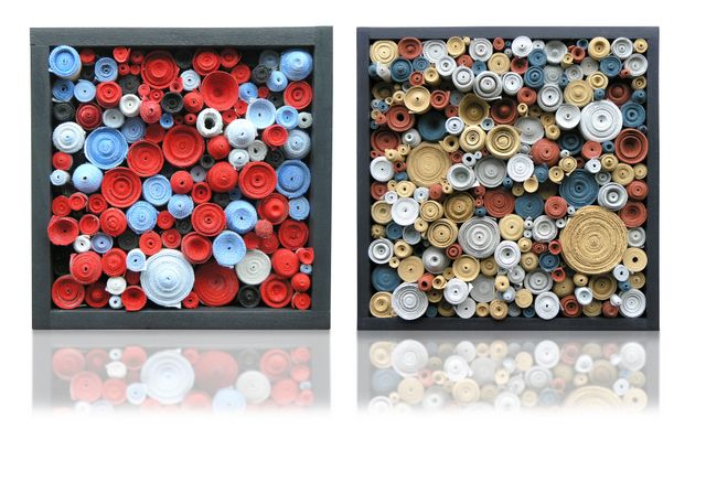 The artist’s works using discarded elastic belts are also stunning. Here above, he mounts his composition on an old wooden door.