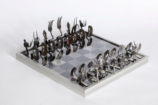 A sense of playfulness permeates through all the work. In the above work, he creates a magnetic chess set made out of old silverware.