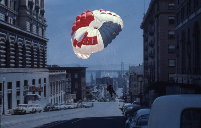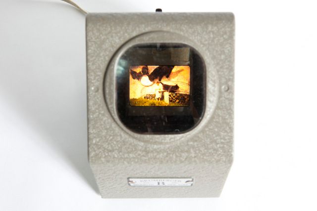 Much of Trask’s materials are sourced through his community. A Bushwick-based artistic family, the Trachtenburg Family Slideshow Players, put up an online post offering to give away their massive collection 35 mm slides from the 1950s to ’80s. Trask accepted their offer and left their apartment with nearly 5000 slides. After sending days sifting through the enormous collection, Trask began to layer slides with similar transparency values and placed them in vintage slide viewers. The results are totally unique and often bizarre compositions.