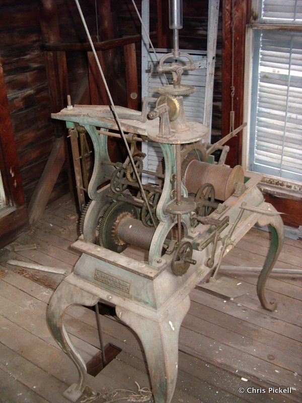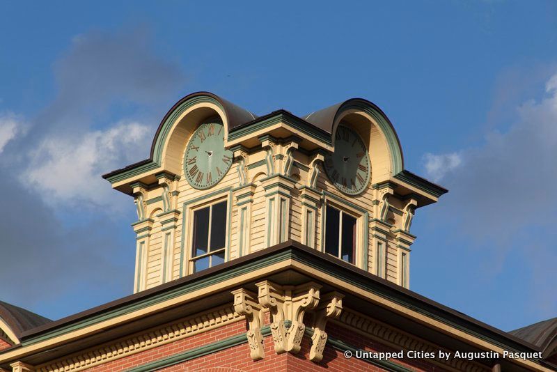 Across the street is the Town Clock/Rea Building from 1874, which was restored by Pickell and is now home to a clothing boutique and a cafe on the ground floor. Pickell discovered the original tin ceiling and other details in the restoration of this structure, built by clockmaker George Rea. The original clock mechanism still exists in the tower, along with the shipping crate the clock came in, stamped with the date 1876. On the same side of the street is the Bank Building, another restoration work by Pickell.