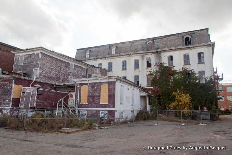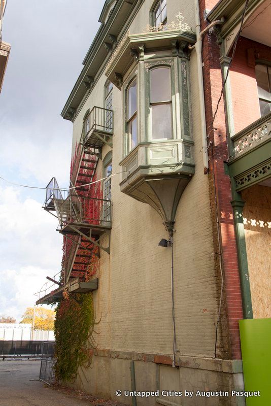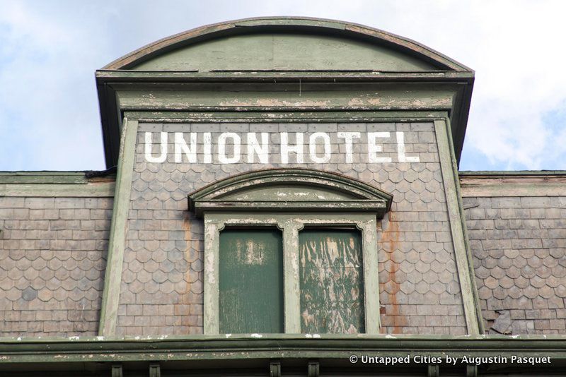 The Union Hotel was built from virgin timber moved by barge from the Upper Delaware River watershed. It was also notable for Depression-era murals by two local artists, including the award-winning illustrator of the children’s books Bambi and The Jungle Book. The backside of the hotel has a wooden extension, which is in very poor shape (below).