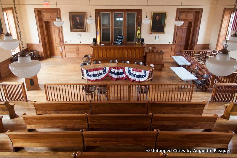 One building that will remain in the plan is the 1828 courthouse and jail, just across the street from the Union Hotel. The courtroom can still legally hold trials but is mostly used for ceremonial and public events, including an annual re-enactment of the Lindbergh trial. Its interior was restored to its 1935 state by Hunterdon County about ten years ago, showcasing original wooden pews, jury chairs, the original fireplace which heated the room and a 48 star flag. Portraits of figures associated with the trial hang in the room.