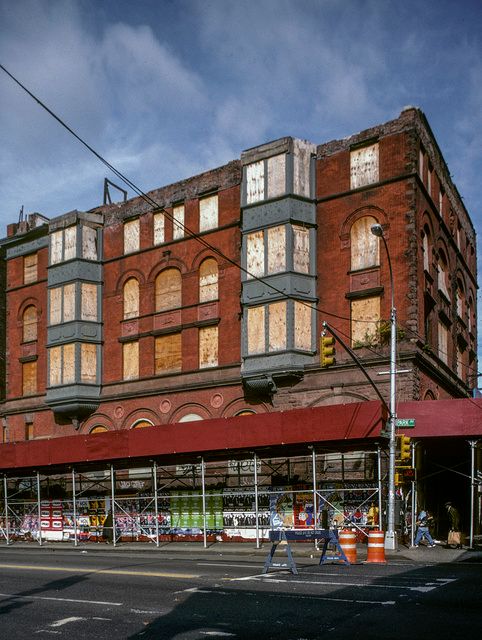 Built when Harlem was a suburb, this Queen Anne and Romanesque Revival structure was situated conveniently next to a ground-level subway station. The Mount Morris Bank and Safe Deposit Company (later a branch of the Corn Exchange Bank starting in 1913) occupied the first floors and luxury were on the upper floors. The three arched openings led to the different functions within the building–the apartments, the subterranean bank vault and the grand entrance to the bank. In the 1890s, the building was doubled in width, taking over a one-story poultry shop along Park Avenue. In 1897, the New York Central and Hudson River Railroad built the elevated subway station, with the tracks above replacing a prior open-cut.