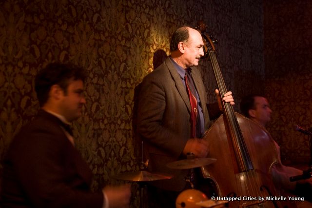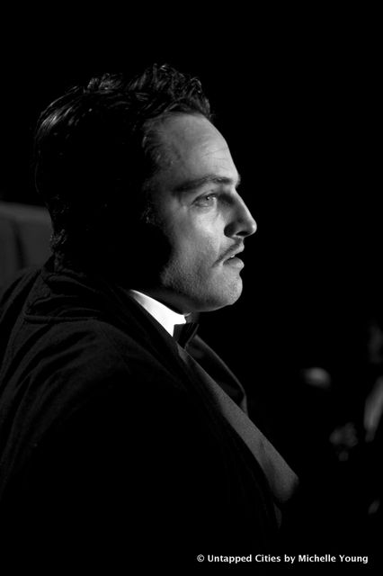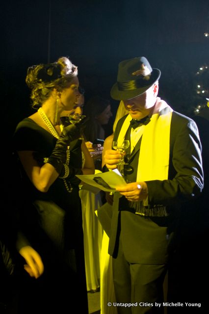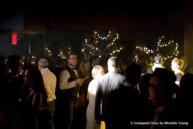 The adherence to alter ego and period costume at the event rivaled the theatrical and culinary extravanganza at the sumptuous feast, which included a procession of suckling pig, chefs chucking oysters with a chainmail glove, and a mermaid posed seductively with lobsters and seaweed. Chef Marc Murphy (chef and owner of Benchmarc Restaurants) concocted period-inspired plates at interactive stations throughout the McKittrick, and 1930s-era cocktails flowed. The sounds of the incredible musical acts whirled through the air between rooms and in the VIP room in the basement, surrealism had its fullest incarnation. With a host of Christmas trees amidst winter temperatures, I was still figuring out if we were outside or inside, in the middle of summer or fall, when Dali reappeared to create a tableau of naked women and handed out his manifesto.