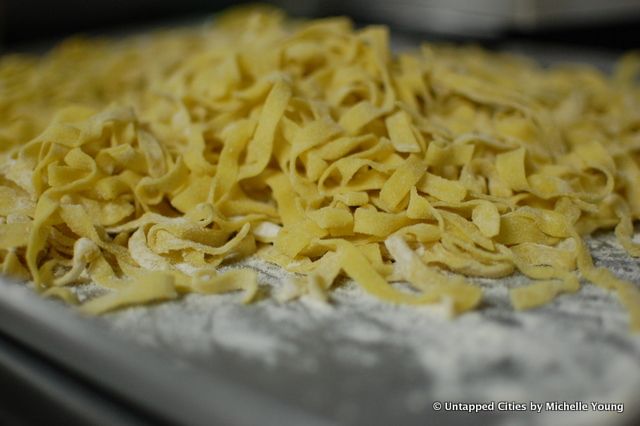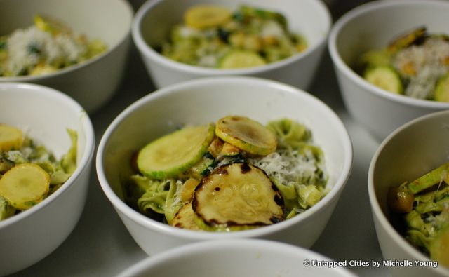 Fresh Egg Fettuccine: basil and chive pesto, roasted garlic, summer squash (Feather Ridge Farm, Rogowski Farm)
