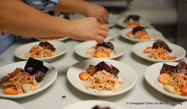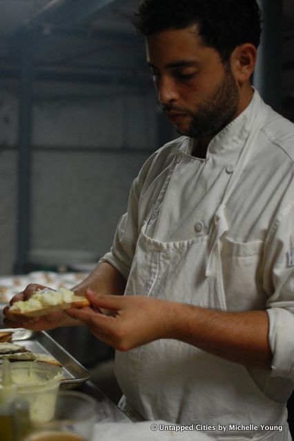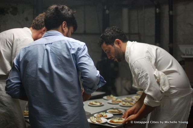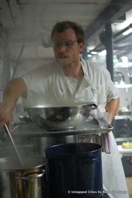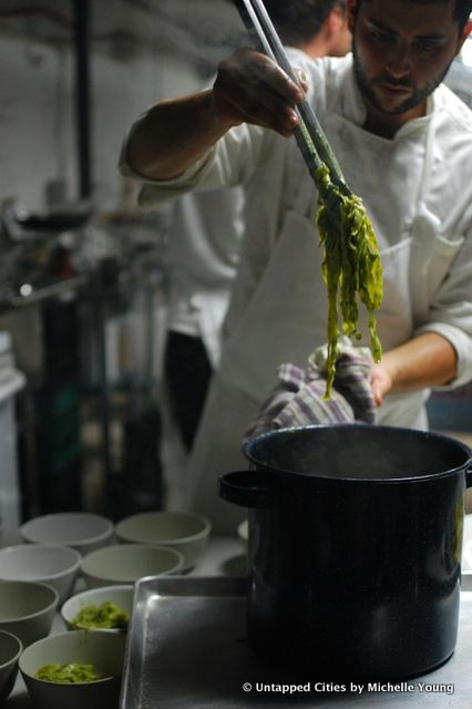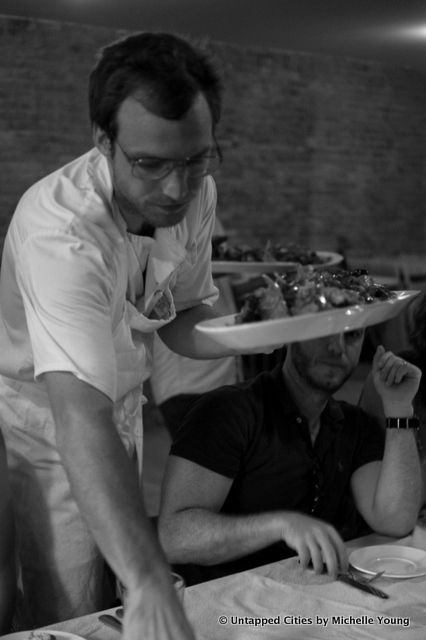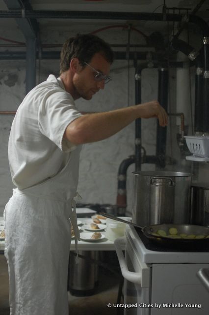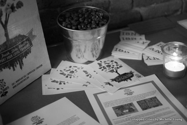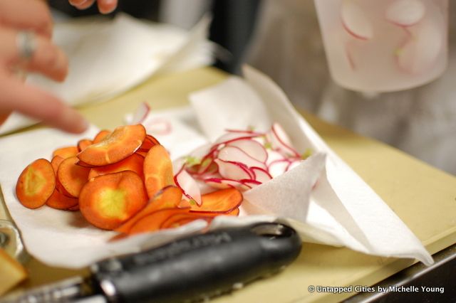 On Sunday night I went to photograph the supper club of LocalRootsNYC, the community shared agriculture program I belong to. The chefs from I8NY were serving a 5-course dinner in the beautiful upstairs room of 61 Local, a bar and neighborhood joint that celebrates locally crafted food. I8NY is a Brooklyn based sandwich stand run by Jonathan Meyer and William Griffin, former chefs at Fatty Crab and Lincoln. The courses for the evening were all created from food provided by the LocalRootsNYC farms, all locally grown. According to Wen Jay Ying, founder of Local Roots, the goal of the evening was to show people what they can whip up with their vegetable shares, and recipes for each course were provided.