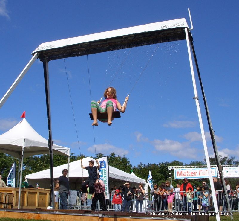 Among other marvels at Maker Faire was Dash 7’s swing set that rained down water from the upper beam. As the swingers pass back and forth beneath the beam the water stops just long enough to let them pass. The swing set is engineered to be timed just right to the rhythm of each individual who uses the swing, though most riders seemed to get a little splash.