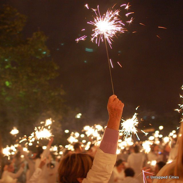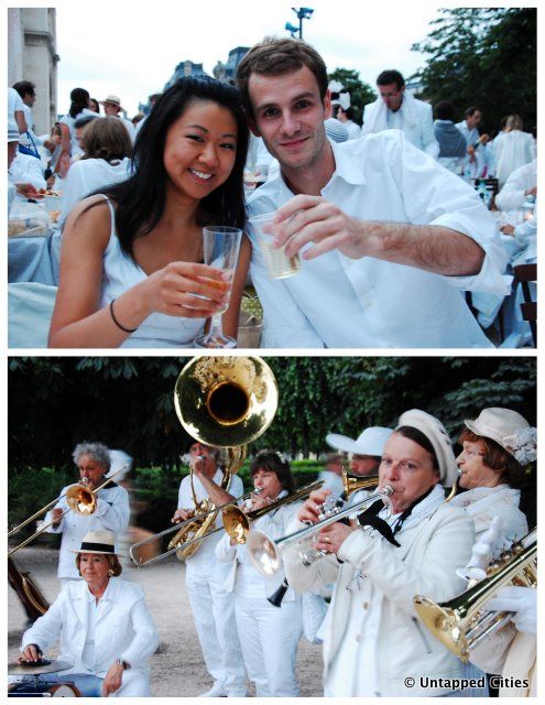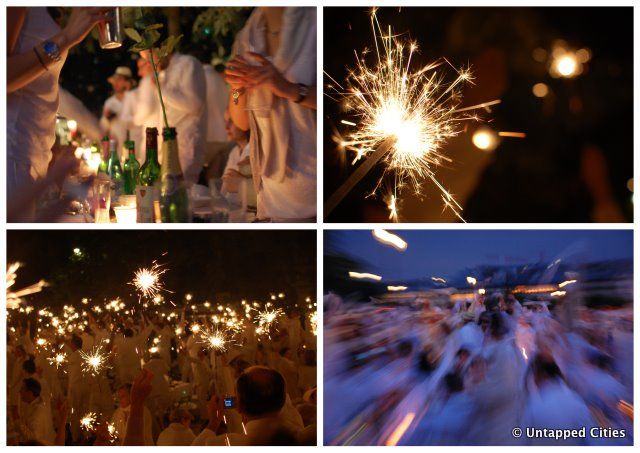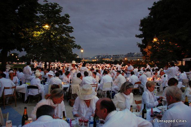 The Dîner en Blanc (White Dinner) did not disappoint this year, with the Carrousel du Louvre as the top-secret location. Approximately 12,000 people descended on the museum courtyard just before 9:30pm. With the location unannounced until everyone had boarded buses from meeting points all over Paris, it was quite the scene on Rue de Rivoli just outside the Louvre. Like a step back into time, men and women dressed all in white with fancy accoutrements, carrying picnic tables and chairs and flowed into the courtyard en masse.
