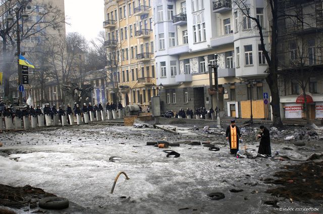 I got as close as I could to obtain shots of the battle, and then noticed a EuroMaidan commander inspecting the police buildup on their right flank. He watched them with binoculars for several minutes, and then simply turned around and walked away. As he retreated from the front, he rolled his eyes and inflated his cheeks with an expression of resignation. I sensed something significant was happening and was soon surprised to see the EuroMaidan forces begin a retreat from the DMZ as I called it. Included in these festivities was a trumpet performance of their national anthem, followed by blessings from Orthodox priests. Everyone but me seemed to know exactly what was about to happen.