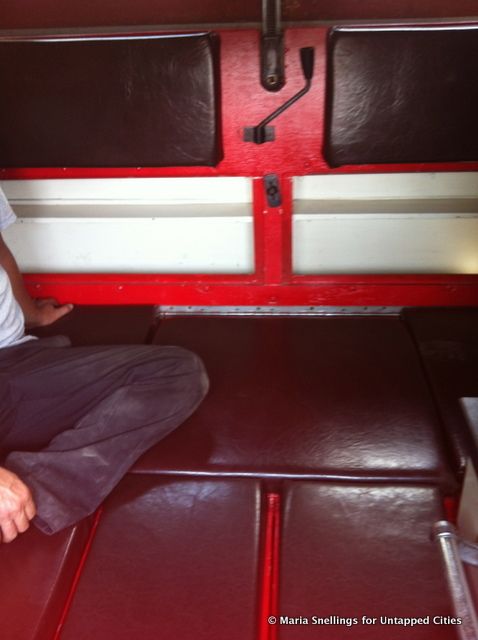 Not only are the windows insulated, the ceiling is also lined with outdoor carpet. Under the ceiling’s carpet, Kloehn put in a layer of bubble wrap, aluminum, and half-inch layer of plywood. On one wall there are four cushions, two which Kloehn removed to show us the storage space behind.