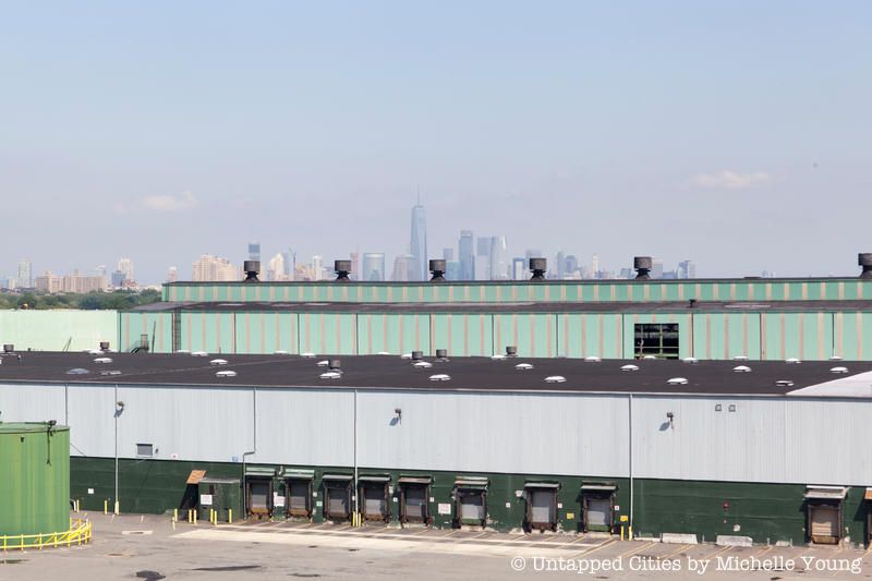 Looking out onto Building 54 (taller building in rear) with skyline of New York City in background