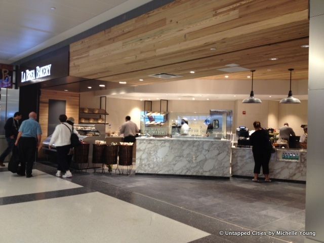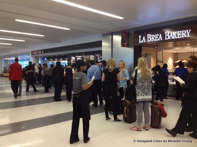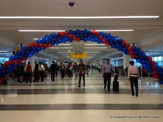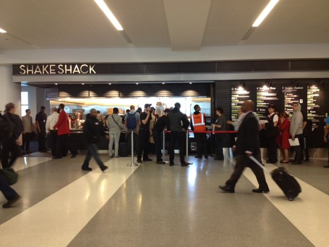 The move of Delta Airlines from the aging, near decrepit Terminals 2/3 into Terminal 4 at JFK Airport came with the addition of 9 new gates and some key new tenants, including Shake Shack. The new area was heralded by balloons today on opening day (attended by Mayor Bloomberg), but most interesting to note, in our opinion, was that the line for Shake Shack at 5:30pm was almost as long as the security line (unless you had TSA Pre-Check, in which there was no line for security). The architecture of the terminal mirrors the rest of the existing Terminal 4–generic but nice.