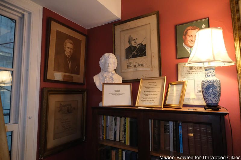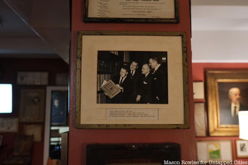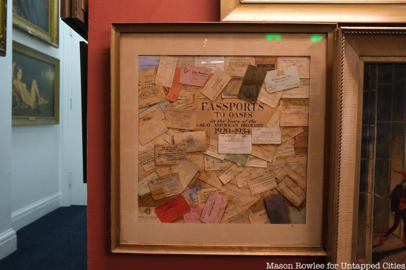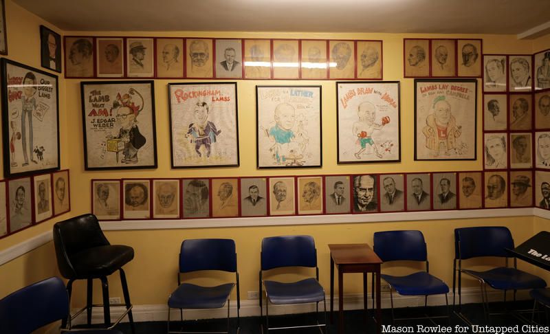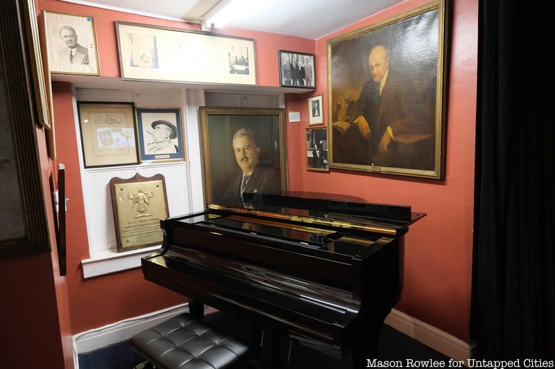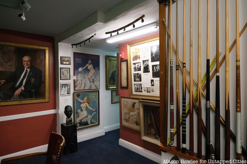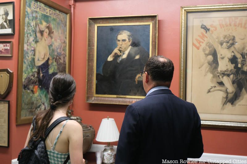 Besides being a theatrical club, the Lambs is also a historical society. The clubhouse’s walls are adorned with an abundance of portraits, letters, autographs, and drawings. There is about $1 million worth of art and memorabilia at the club including sets of martini glasses, a few hundred railroad tickets, speakeasy cards, letters, china, and more! “It’s about the continuity of connecting to the past and present,” says current member Peter Dizozza. All the portrait paintings in the club were done by well known artists of their era, such as James Montgomery Flagg who designed the iconic “I Want YOU!” 1917 political poster. You can also spot a portrait of John Barrymore and Edwin Thomas Booth, art by Stanford White, and a ghostly portrait of Montague.