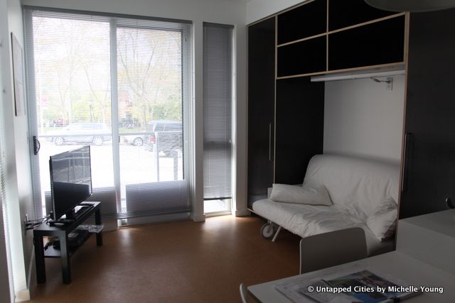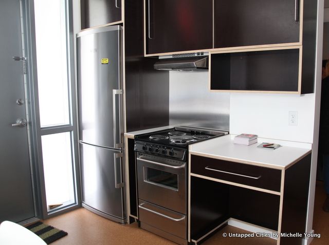 The modular structure was built in Indiana and trucked to NYC over the course of two days. It took 13 and a half hours to put together, which you can see in timelapse and additional couple weeks to finish the interior. The entire structure complies with NYC building codes and is 100% ADA compliant for handicap and special needs. The unit has one three-bedroom apartment and two one-bedroom apartments.