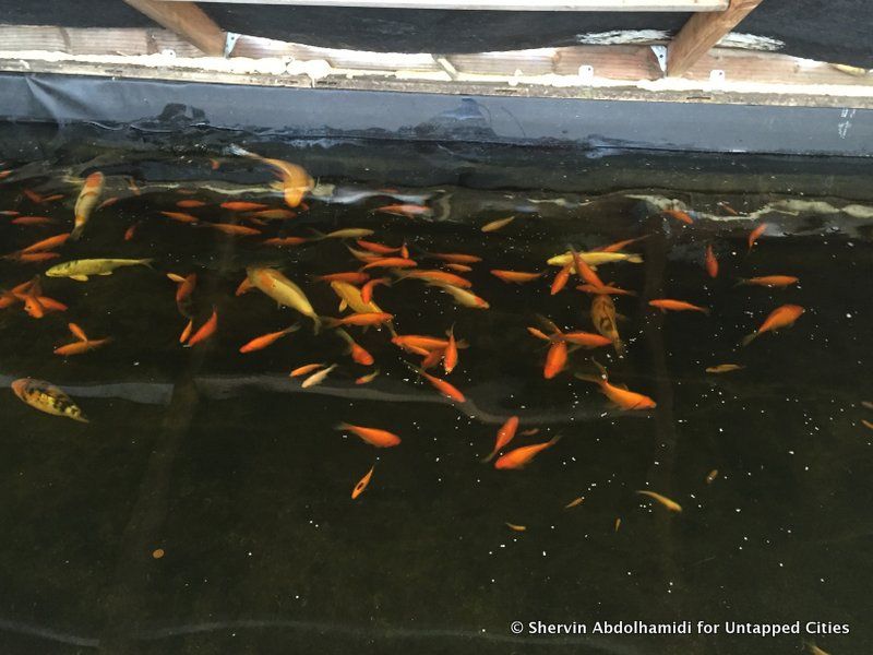 Yemi Amu, the founder of Oko Farms first shows us her indispensable fish tank—the cornerstone of the process. Rather than using tilapia, the traditional urban fish farmed since antiquity in Egypt and China, Yemi has been experimenting with different types of fish, such as catfish (also edible), and ornamental fish like koi and goldfish. She explains that while tilapia have a very short maturity cycle, they just aren’t suitable to the cold climates of New York City. She states, “We currently do not sell our fish [as] we are still experimenting with various types of fish. They are currently a source of nutrients. We do however harvest the warm season edible fish, cook and share with the community.”