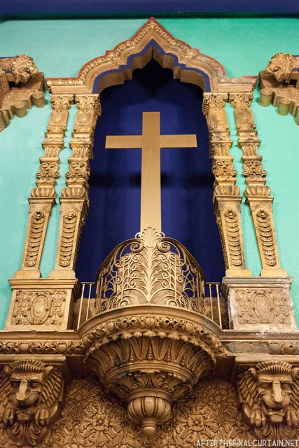 For the Valencia Theater, Eberson chose a Spanish/Morrish/Mexican/Baroque theme, and somehow managed to blend elements from all of these styles in both the exterior façade and interior spaces. He was heavily influenced by the work of Spanish architect J.M. de Churriguera, whose buildings merged ornate Italian Baroque, Moorish and Gothic elements. In keeping with the Churrigueresque style of excessive ornamentation, the façade of the Valencia Theater dazzles the mind with columns, swirls, shells, wreaths, and faces. To add to the aquatic theme, a mermaid sits in the center, above the swarm of peering faces.