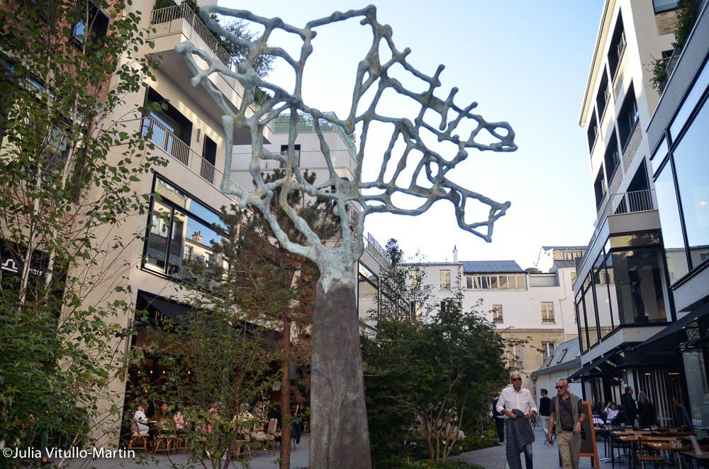 In naming his real estate company Emerige, chairman Laurent Dumas invented a word he says means “building for the love of it.” With Beaupassage he sought art that would reflect Beaupassage’s intent and fit into a specific relationship with the scale of the buildings. L’Arbre Neuronal, for example, shows a tree trunk capped with what artist Marc Vellay calls a neuronal head of hair flowing with constant energy and is poised elegantly between the low-rise buildings. Project architects Franklin Azzi and Frédéric Bourstin drew inspiration from old and new, and incorporated as many materials as possible from the old site, such as limestone, brick, cement, iron, and glass.