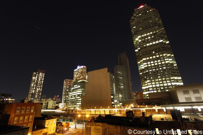 The rooftop provided nice low-rise views of the new Long Island City, and the Court Square 7 train station. Here, two 7 trains passed the station on a still night.