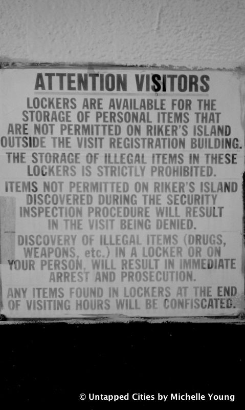On the other side of the bridge, there are two main buildings–one with an ID checkpoint and security line and another sparsely-entered one. After going through the ID checkpoint and X-ray scan, James & I discovered that nobody knew where we were supposed to be. We were forwarded from supervisor to supervisor until someone realized we were supposed to be in the building next door. To this day, I am not 100% clear on the difference between the two entrances, but it seems related to whether you are coming in as a “regular visit” or an institutional visit, of which we were the latter. At any rate, here we show our IDs again and are given a plastic badge with a number on it and a invisible hand stamp (shows up only with UV light). We then cross a big parking lot to get to the RNDC (Robert N. Davoren Center). On the last day we were instructed to cross this parking lot in groups of three, “so we wouldn’t get stopped.” This seemed strange, but we don’t generally question correction officers, on principle. Rikers is massive, and even the officers comment on how “far” the RNDC is from the entrance.