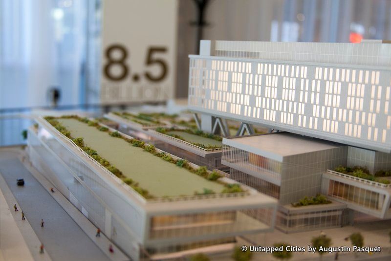 Model of the hotel on the right, atop the green roofs of Empire Outlets