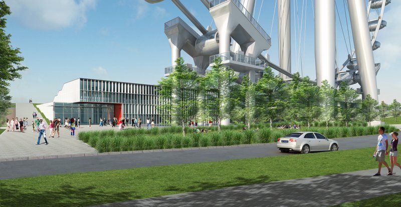 The garage will include a six acre green roof, outfitted with a green lawn supported by 2 to 4 feet of soil, 260 trees, a playground, restaurant, and concert venue. Also at the base of the wheel will be a 100,000 square foot Terminal Building. The developers project that 30,000 riders will take the wheel per day, which would be about 4.5 million riders per year.