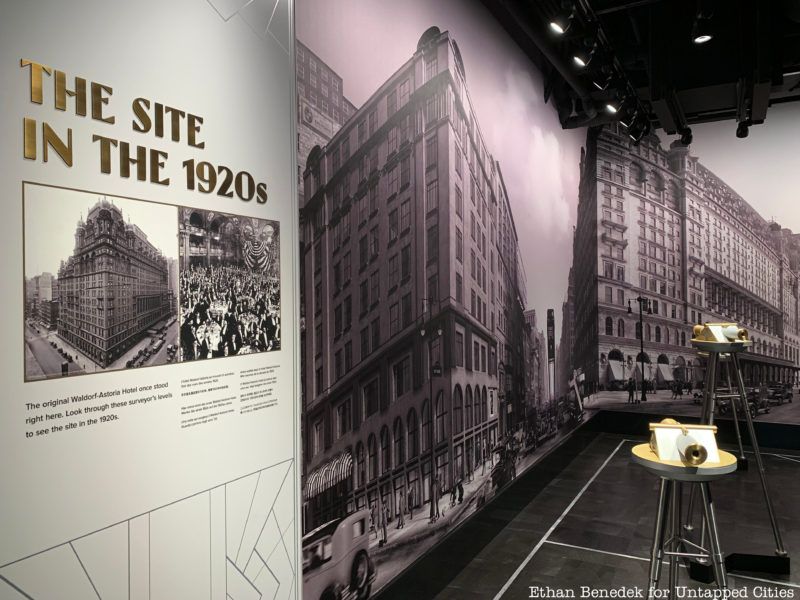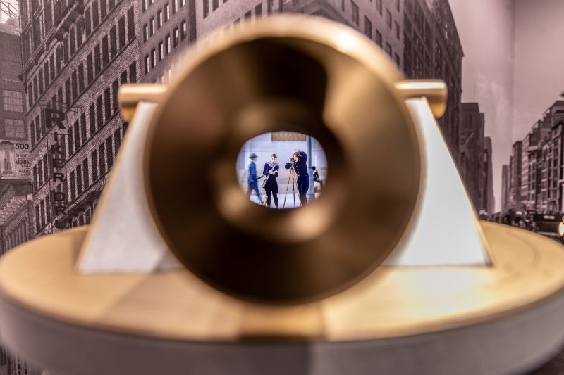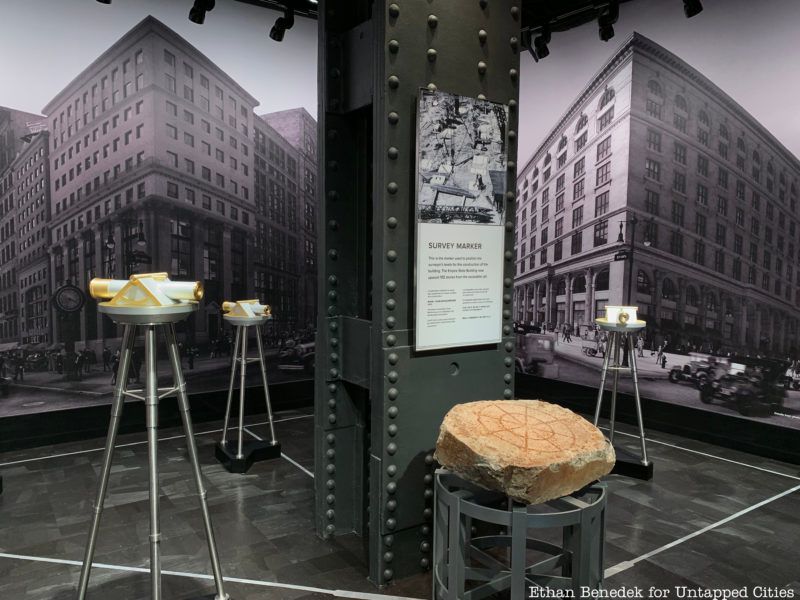 As visitors walk through the exhibit, they will have the opportunity to see back in time to the history of the skyscraper’s construction and the extraordinary construction process that made it unprecedented for its time. At the beginning, several telescopes mimic original survey markers, used to position the levels of construction. Looking into the lens of the markers, visitors can see short film clips of actors in historical dress reenacting day to day interactions that would have occurred on the street outside in the early days of the building’s construction.
