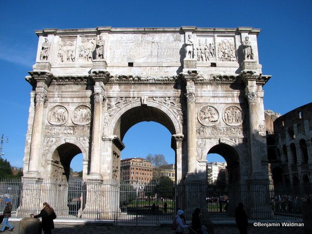 The Arch of Constantine, located in Rome, was erected in the year 312 to commemorate Constantine’s victory over Maxentius.
