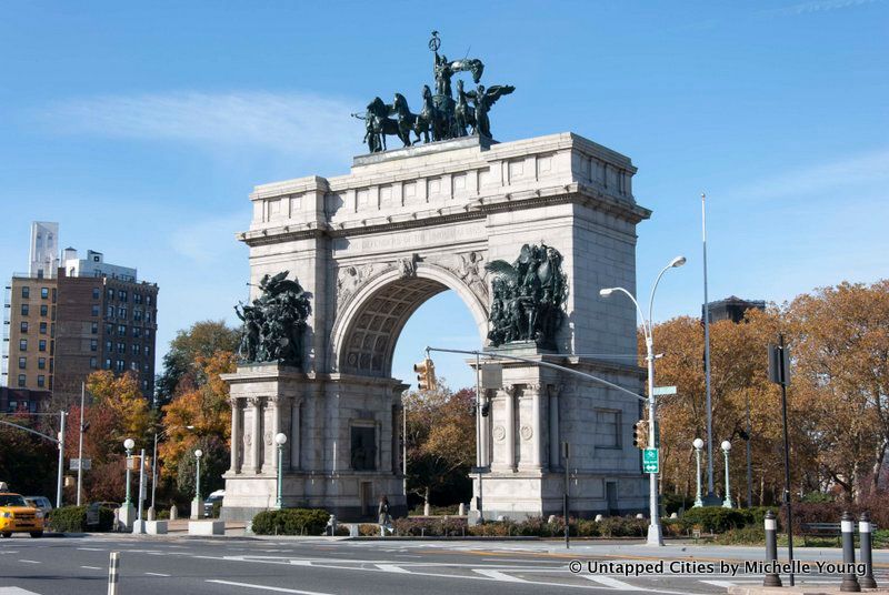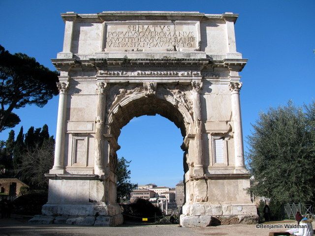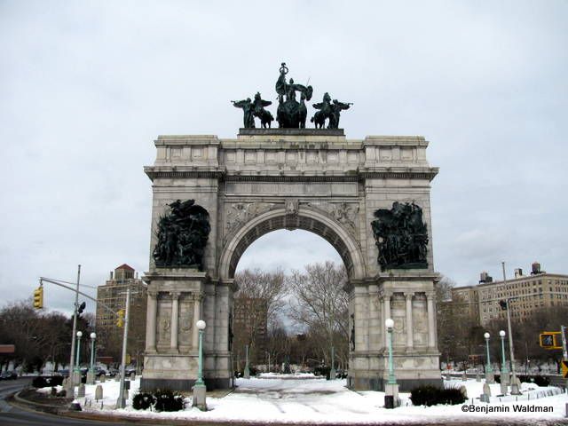 The Arch of Titus, located in Rome, was erected in the year 82 to commemorate Titus’ victories. Its interior bas-reliefs depict the the spoils from the siege of Jerusalem. The Stanford White designed, Beaux-Arts, Soldiers’ and Sailors’ Arch is located in Grand Army Plaza in Brooklyn, and was modeled after the Arch of Titus.