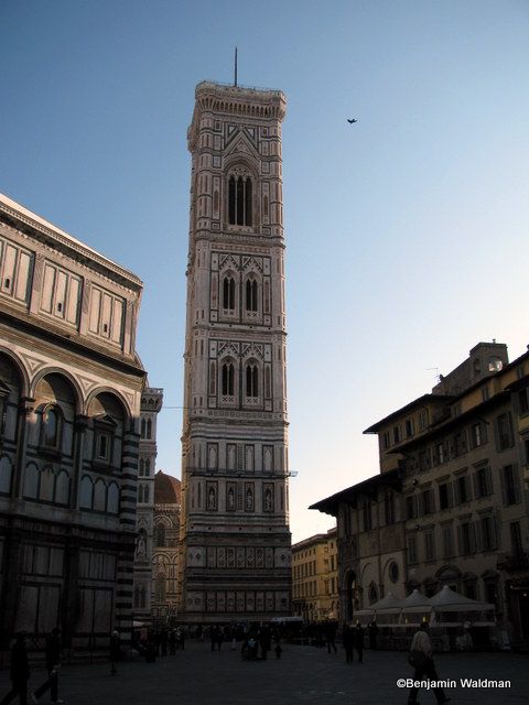 Giotto’s Campanile, in Florence, was designed in the Florentine Gothic style and complements the Duomo (Cathedral) and Baptistry of St. John. The previous New York Times Building at One Times Square was modeled after the Florentine Campanile.